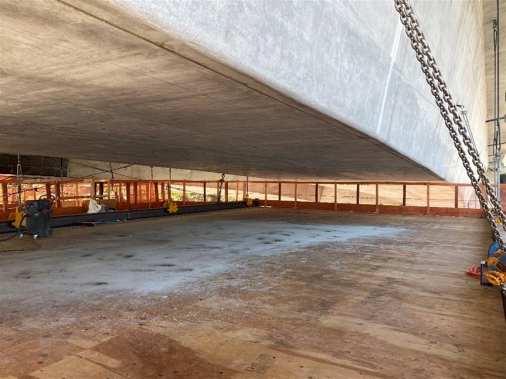 In order to install the custom access platforms below the bridge, Rampart Hydro-Services, LP. (Rampart) was engaged to utilize their hydrodemolition technology to cut bridge overlay windows to locate old form traveler holes in the segmental bridge sections. Once the old form traveler holes were located, Rampart utilized hydrodemolition to cut through the 2 ft thick concrete segmental flanges sections to provide access holes for the platform hoist. Hydrodemoliton was also used to remove concrete center span access holes for the crew to access the interior span sections. This environmentally safe, dustless, and quick technology was utilized over conventional removal methods to avoid vibration and damage to existing post-tension strands in the critically compromised structure.